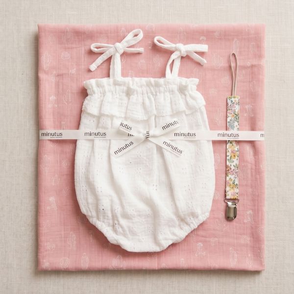 Pack bebé muselina 70×70 + ranita bordada + chupetero floral Algodón 100%